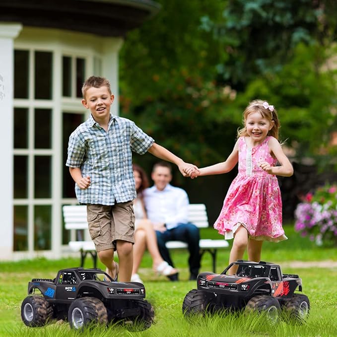 - 【4WD & All-Terrain Tires,Conquer Any Surface with Ease!】: Powered by 4-wheel drive and dual motors, this monster truck remote control car features anti-skid rubber tires for smooth performance on grass, sand, mud, and snow. Perfect for indoor and outdoor play, it handles rough or slippery terrains effortlessly.