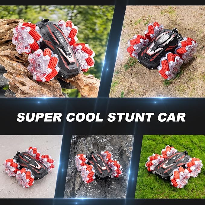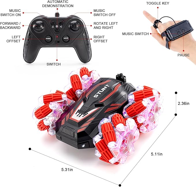 - 2.4GHz Remote Control and Gesture Control - Simple control of 2.4GHZ remote control, clear instructions, simple independent keys, can make children easy to get started.You can wear remote control watch to drive the gesture sensing RC stunt car. This hand controlled RC car will perform stunts according to your gesture. It's a sensitive gesture RC car.