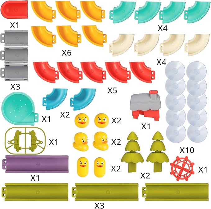 • 【DESIGN IT YOURSELF】There are 51 pieces in this bathtub toy set, including the suctions and the ducks. Yet you can design the tracks in many turns or straight, up or down, left or right. Do it with your imagination! Creative bath toys for toddlers age 3+