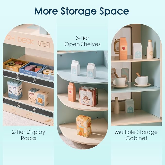 - ROLE-PLAYING FUN: Here, they can take on different roles and experience the fun of being a shopkeeper, customer, or shelf manager. Children can simulate shopping scenes, pick their favorite items and place them in the shopping basket, or play as shop attendants serving other friends, learning to communicate and share.