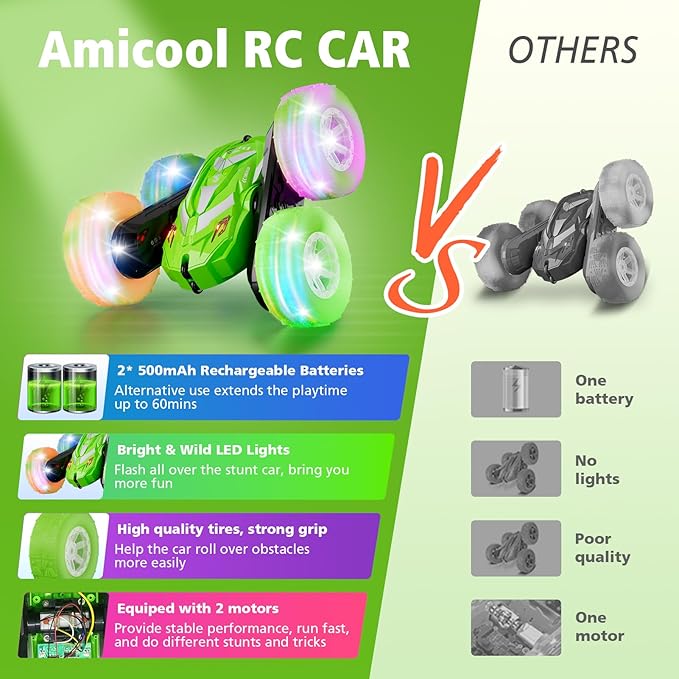 - [ Cool & Wild Lights - Drive Day & Night ]-Amicool remote control car features dazzling, multicolored LED lights in its wheels, which are a creative take on the LED headlights design. This mini remote control car will bring you easy & smooth driving as well as glittering & brilliant visual enjoyment, and definitely makes it much easier to track your remote control vehicle at night.