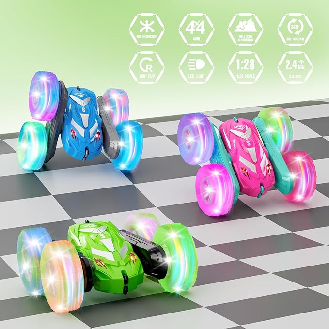 Remote Control Car for Boy 6-12 with Flashing Light, 6 7 8 9 Years Old Boy Toys, Race RC Cars Stunt Drift 4WD 2.4Ghz Double Sided 360° Flip, Boys Gift Idea for Kids Birthday Christmas, Green