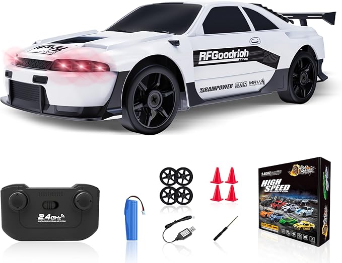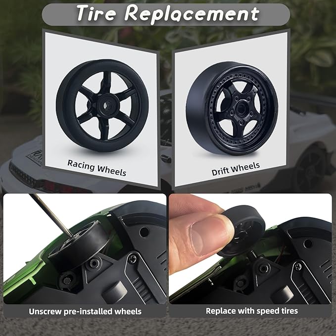 - Tire Configuration: Drifting car comes with 4 speed racing tires and 4 drift tires. When you want to show off this high-speed RC drift car with stunts, you can drift on smooth boards, tiles, tracks with better handling and good agility, and when you want to make it a sports car, the racing tires will be your better choice. One toy car double fun