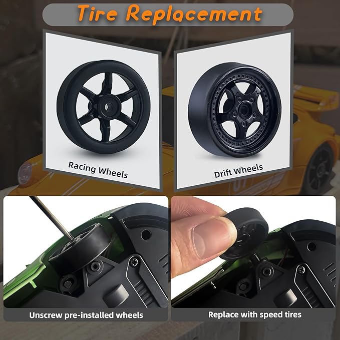 • Two Replaceable Tires: Our mini drift cars come with 4 speed racing tires and 4 drift tires. When you want to show off this high-speed rc drift car with stunts, you can drift on smooth boards, tiles, tracks with better handling and good agility, and when you want to make it a sports car, the racing tires will be your better choice. One toy car double fun