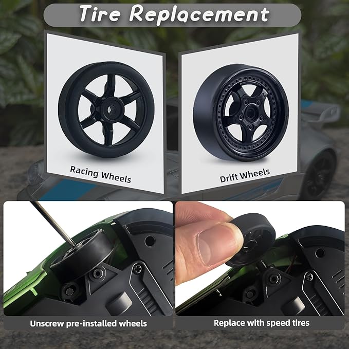 - Two Replaceable Tires: Our mini drift cars come with 4 speed racing tires and 4 drift tires. When you want to show off this high-speed rc drift car with stunts, you can drift on smooth boards, tiles, tracks with better handling and good agility, and when you want to make it a sports car, the racing tires will be your better choice. One toy car double fun