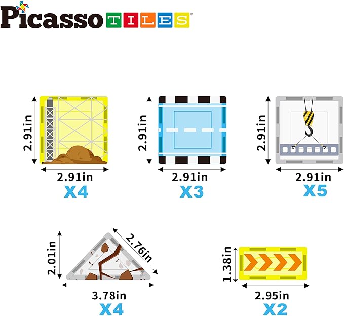 - DREAM BIG & BUILD BIG: Discover 18 printed magnet tiles featuring construction themes and 8 playful magnetic construction vehicles, including a Crank Truck, Excavator, Bulldozer, Road Roller, Concrete Mixer, Tractor, Dump Truck, and Forklift. Use this toy as a starter set or as an add-on and seamlessly integrate it to any of our full-sized PicassoTiles playsets. Open up endless possibilities for imaginative play and adventures with this kit.