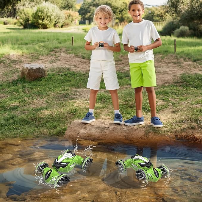 - Amphibious RC Car Surfing on the Water: The 4WD Summer toys Amphibious rc boat is not only a land racer, also can surf on the water! unning forward, backward, left, right, move body up & down, twist and race to your order by hands. Our RC amphibious vehicle is designed for kids who love adventure and excitement! Precisely sealed design makes it water and weather proof to conquer any extreme situation.Perfect for kids and adults alike,Outdoors boy toys age 8-10 years old