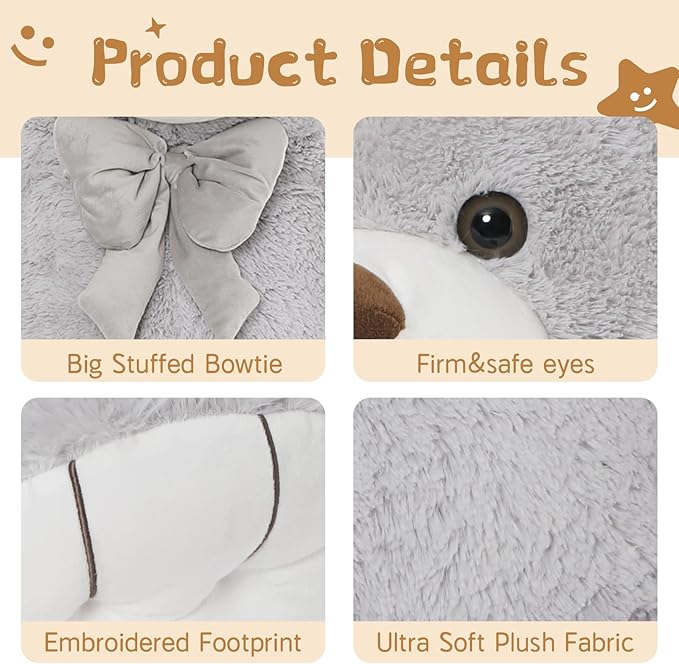 • Adorable Design: The giant bear toy has adorable smile expression, every time you see the smile bear, it will bring you a happy and relaxed mood,the bow tie make it both elegant and unique. You just cannot help hugging the plush teddy bear. The stuffed teddy bear can also be a decoration for living room,bedroom,office or theme party.