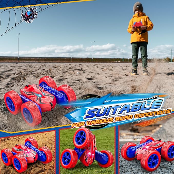 • COOL RC CAR: Our remote control car features 4WD drive and supports front and back movement, left and right turns, and 360° rotation, allowing for full 360° drifting. Its double-sided flip function easily overcomes obstacles, bringing speed and excitement to your child's driving game experience