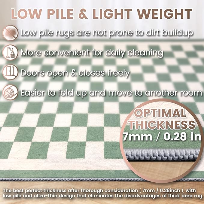Washable 5x7 Checkered Area Rug for Living Room, Sage Green Checkerboard Modern Boho Large Rugs, Ultra Thin Low Pile Lightweight Indoor Carpet with Non-slip Backing for Bedroom Classroom Playroom Kids