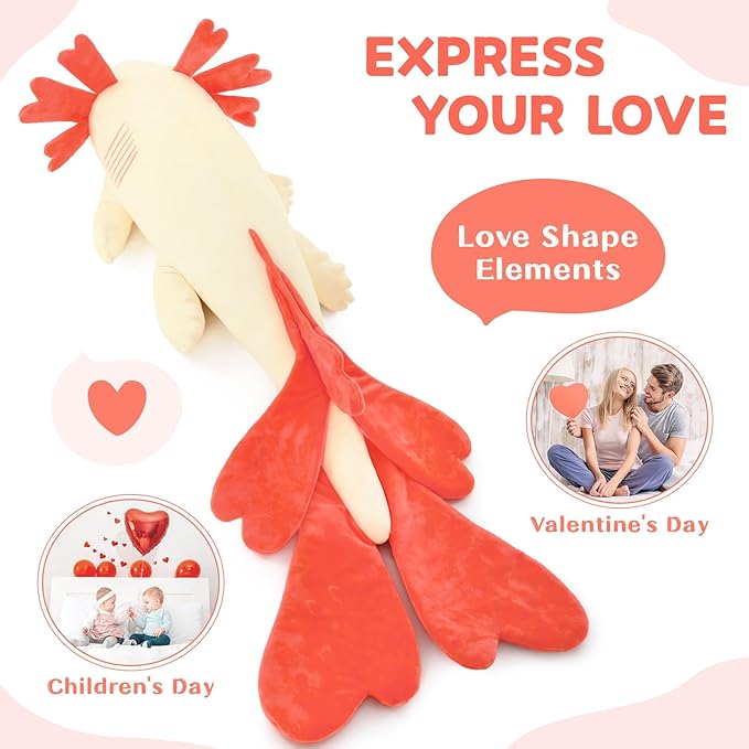 Axolotl Stuffed Animals Long Body Throw Pillow, Giant Love Heart Salamander Plush Bolster Body Pillow, Christmas Birthday Valentines Gift for Sider Sleeper Kids Girls Boys Adults