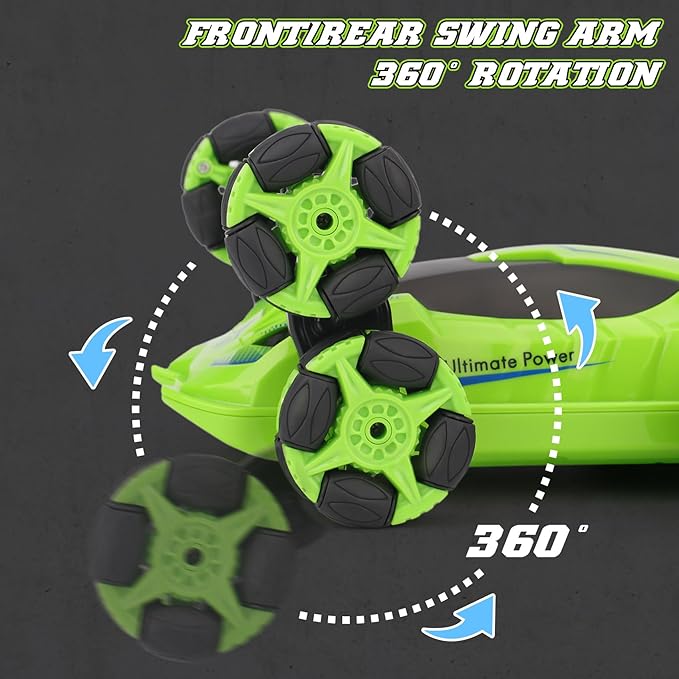 • 【Terrain Conqueror】Fashionable drift stunt car with unique 360° rolling traction tires and 4 rocker arms can conquer various terrains like roads, forests, lawns, and gravel. It's flexible enough for rotation, swing arm climbing, and drift in all directions.