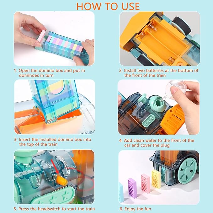- 【Safe Educational Toy】Domino Train Toy is made from the high-quality ABS material, non-toxic materials, no smell, slippy surface, ensuring a safe and worry-free playtime experience. It is easy to play: Put dominoes in the container and press the container in the train, turn on the switch, and train releases them when it go over the floor or table and leaves a row of dominoes. It is for 3+ year old toddlers, including autistic, helps them learn valuable life skills. Keep your kids happiness and safe with you, enjoy the Joy of Family!
