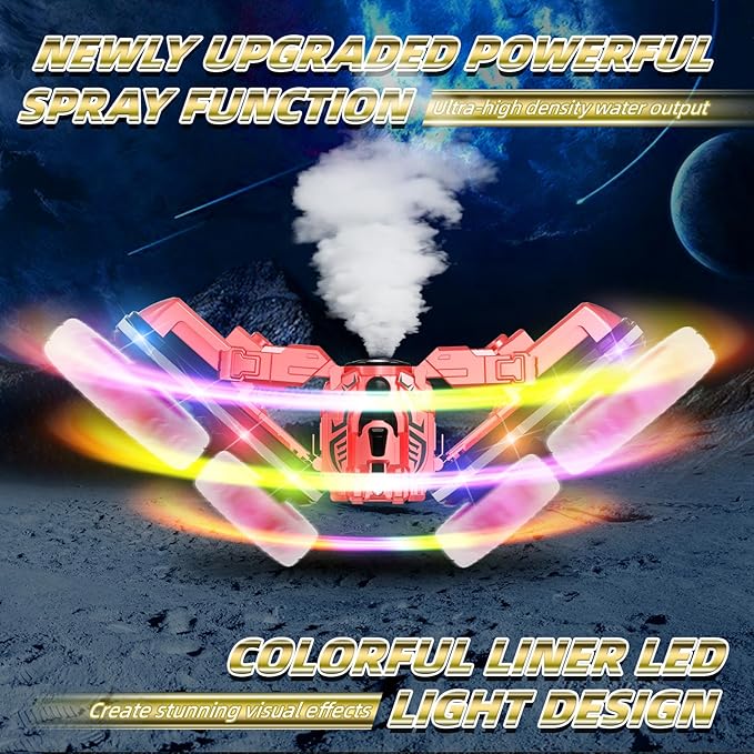 - ๐ใSpray Function & Colorful Linear LightใThe newly upgraded spray function boasts a larger capacity, fuller coverage, and a longer range. The unique, cool linear light design makes your car the most eye-catching presence at night. The spray and lights can emit colorful sprays, providing you with a fun experience unlike other stunt cars.
