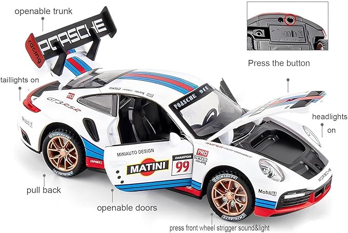• Porsche 911 GT3 model car with cool sound & lighting ,openable doors,trunk and hood.Pull Back by friction.