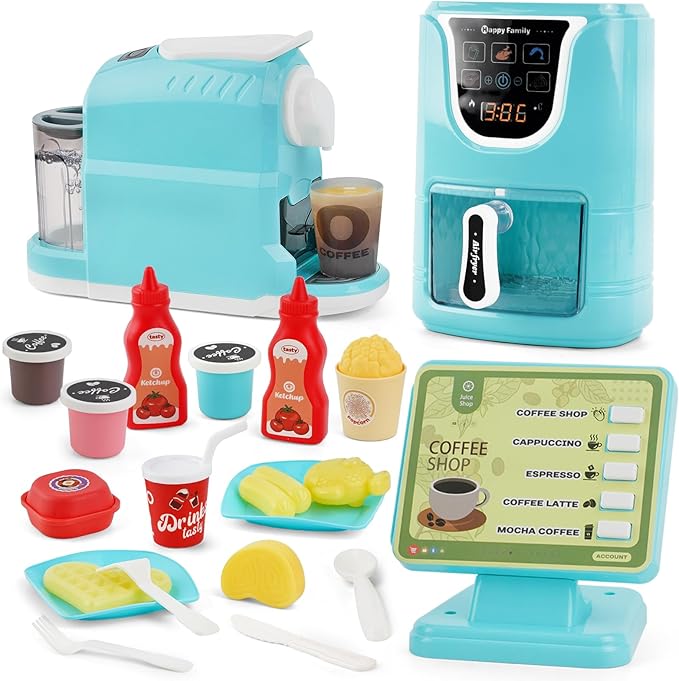 • Cash Register & Coffee Maker:This coffee machine combined with cash register toy is suitable for multiplayer games,Including coffee capsules, coffee cups, dessert sets, etc.You can play with friends or family indoors or outdoors, play roles in coffee shops.