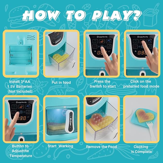 • Toys Air Fryer : It features a clear plastic window that lets children watch as their play food cooks, The color of play food toy will change after cooking.4 different baking modes,Exercise children's imagination and find more ways to play.