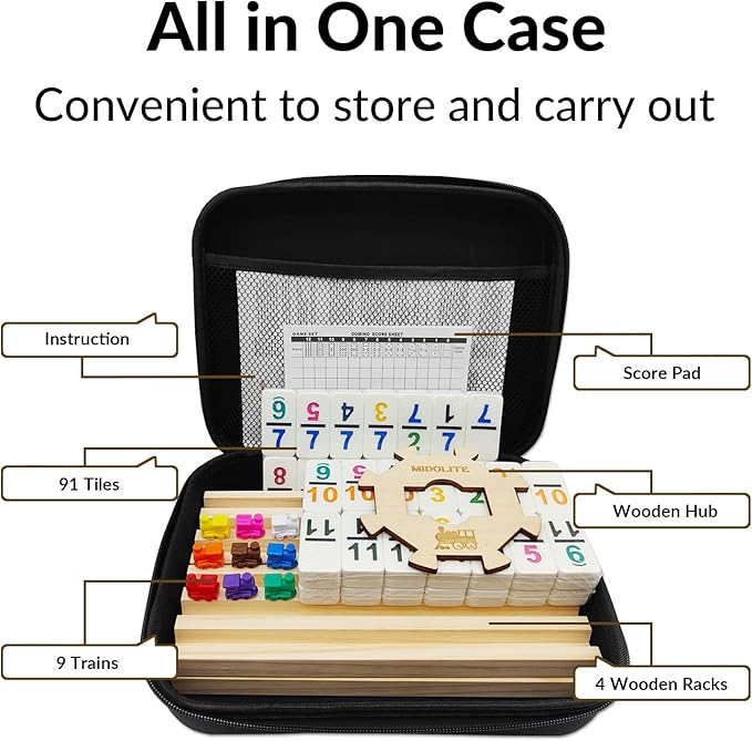 • Premium Dominoes Set Included: 91 colored tiles, 4 wooden racks, wooden hub, 9 trains, instruction, scoreboard, portable case. MIDOLITE dominoes set is equipped with everything you need to play.