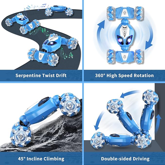 - FULL-FEATURED STUNT CAR: Gesture remote control stunt car all-round movement, Drift, twist, turn, and rotate like a pro—this car does stunts like it's auditioning for a movie. 360° spins? Check. Double-sided driving? Oh yeah. S-shaped movements? Absolutely. And whether it’s gravel, sand, grass, or mud, this stunt car makes it look easy. You won’t believe your eyes!
