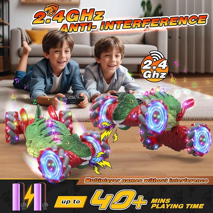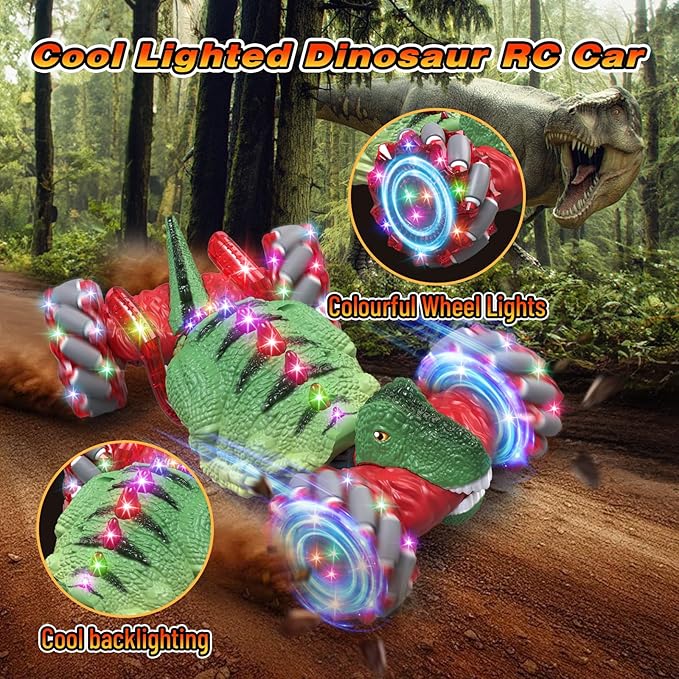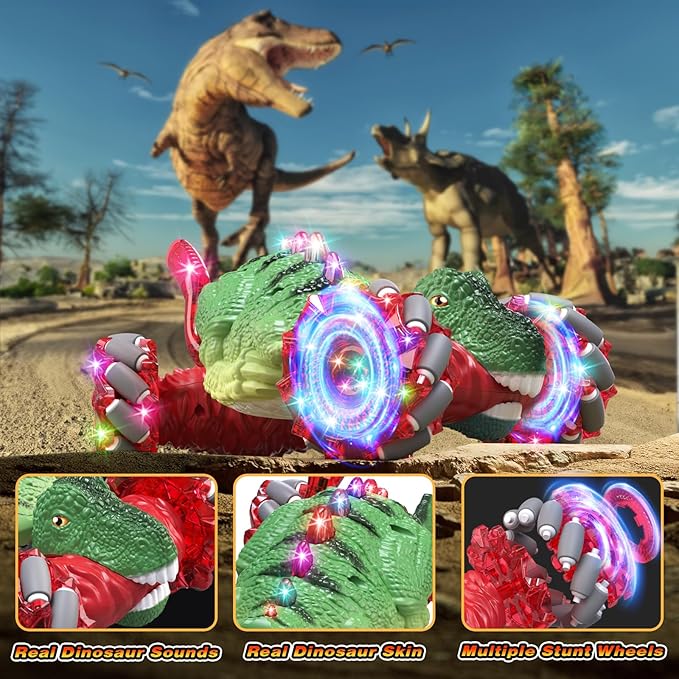 - [OSIMILY Dinosaur Remote Control Car]-OSIMILY newly upgraded world's first original dinosaur gesture remote control Car!The remote control car is designed with real dinosaur shape. Realistic dinosaur shape and skin touch are always attractive to kids!The unique LED lighting design of the RC car creates a gorgeous rainbow track with LED lights on the wheels when kids are driving outdoors. Meanwhile, the RC car is equipped with realistic dinosaur sound effects and music, providing an immersive driving experience for kids!
