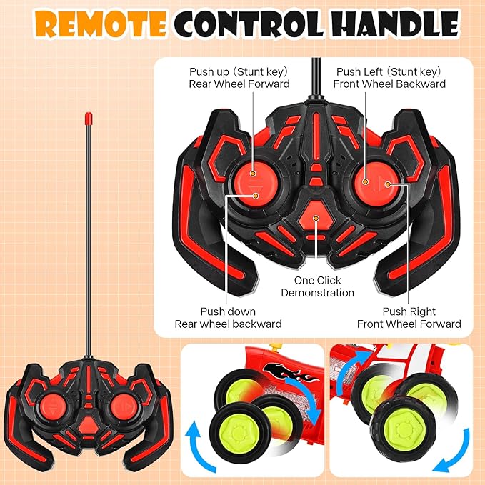 • Fun Jumping Car toys: The toddlers remote control car can stand 90°upright and forward and backward bounce, four wheels can be flipped 360° to achievce movement. The head hat will swing with the movement of the car, bringing children a pleasant operating experience and visual effects, cool features and unlimited fun