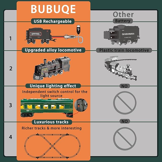 - ๐โจใDurable Alloy Build, Safe & High-Qualityใ: The locomotive steam engine is crafted from premium alloy materials, while the other parts are made of sturdy ABS plastic. This combination makes the train set more durable, impact-resistant, and stable on the tracks, reducing the risk of derailmentโunlike flimsy, all-plastic, battery-powered trains. Certified to meet U.S. toy safety standards, this train set ensures a secure and enjoyable playtime for kids and families alike.