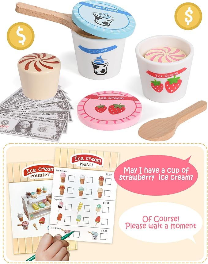 - CONES & ICE CREAM & POPSICLES: Kids love to play role-playing games. Play an ice cream game with the kids! Our set consists of 1 stand, 6 wooden ice cream bars, 6 ice cream cones, 2 cans of ice cream, 2 wooden scoops, 1 ice cream scoop and a set of toy notes and coins, plus a menu. Our complete set, with a variety of flavors of ice cream model, children can freely match, create their own ice cream combination, stimulate their creativity, let them become a little ice cream master