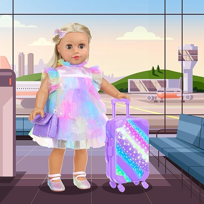 • Package Included: 1 pcs Purple Rainbow Doll Suitcase+1 pcs Purple Crossbody Bag+1 pcs Neck pillow + 1 pcs Colorful Dress+1 pcs Bow Hair Clip +1 pcs Doll Panel Computer+1 pcs Doll CellPhone+1 pair Dance Shoes +1 pcs Doll credit card+1 pcs Passport+2 pcs Doll Air tickets ( Dolls are not included)