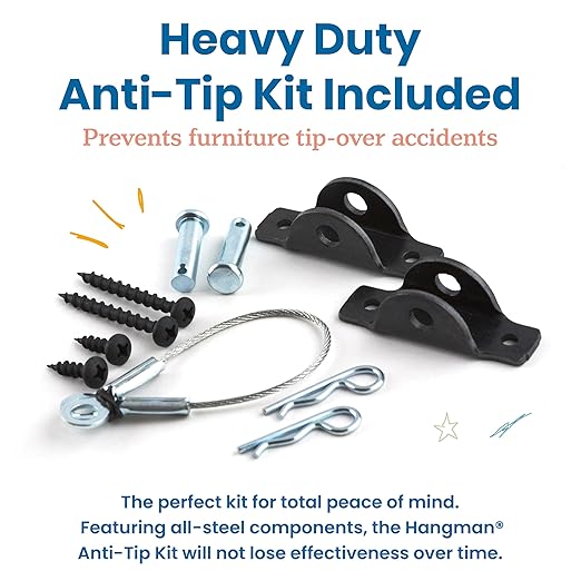 • Anti-Tip: Contains a heavy-duty HANGMAN Furniture Anti-Tip Kit featuring all-steel components; when properly installed using the attached instructions, prevents furniture tip-overs