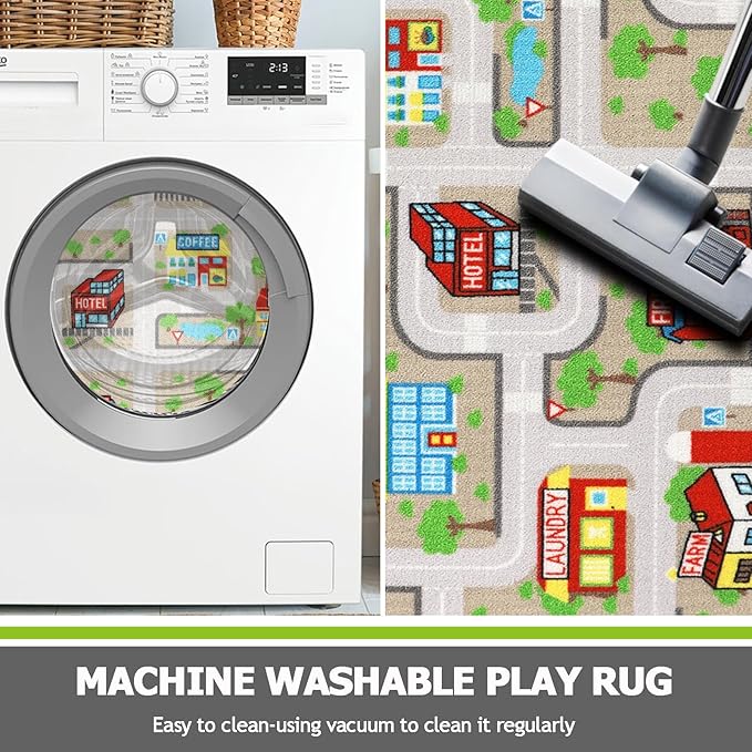 - 【City Traffic Road Carpet for Boy Girl】:This traffic road rug decorated with multiple patterns such as School, Hospital, Fire House, Police, Church, Shop, Gas Station, Laundry, Book Store, Hotel,Bank, Farm etc. So that children can learn a lot of knowledge while playing.