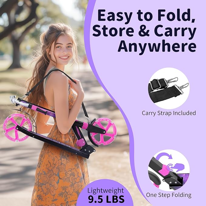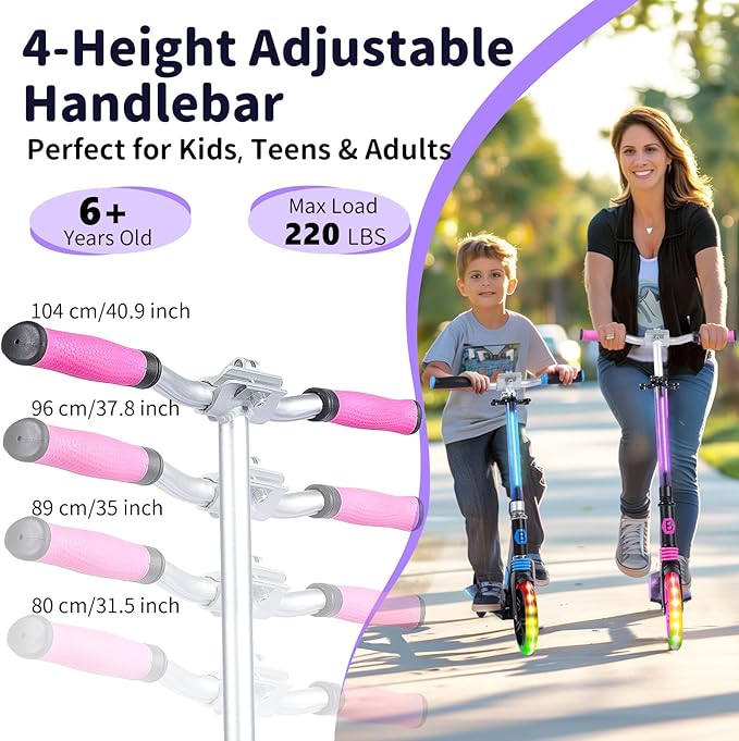 BELEEV V8 Scooters for Kids Ages 6+ with Light-Up Deck, 2 Wheel Folding Scooter for Adults Teens, 4 Adjustable Height, Lightweight Sport Commuter Scooter, Sturdy Frame, Max Load 220 lbs