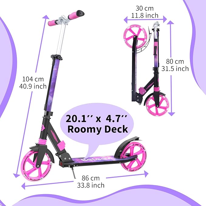 - Cool Riding and Safe: The scooters feature LED flashing glowing wheels that require no batteries and the faster you go, the brighter the lights become. All scooters have battery-powered LED lights on the stem and deck with 6 colors of light effects that can be turned on or off, you will love this special feature that makes your scooter unique! Help keep you safe on darker days.