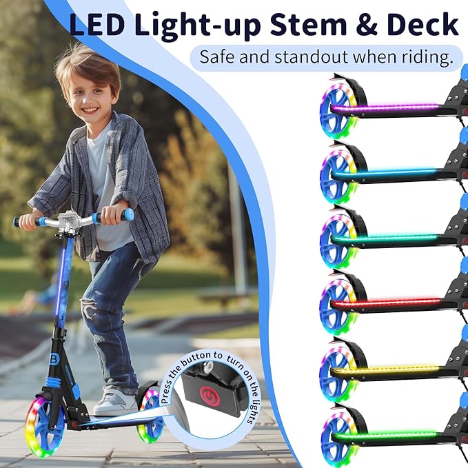 BELEEV V8 Scooters for Kids Ages 6+ with Light-Up Deck, 2 Wheel Folding Scooter for Adults Teens, 4 Adjustable Height, Lightweight Sport Commuter Scooter, Sturdy Frame, Max Load 220 lbs