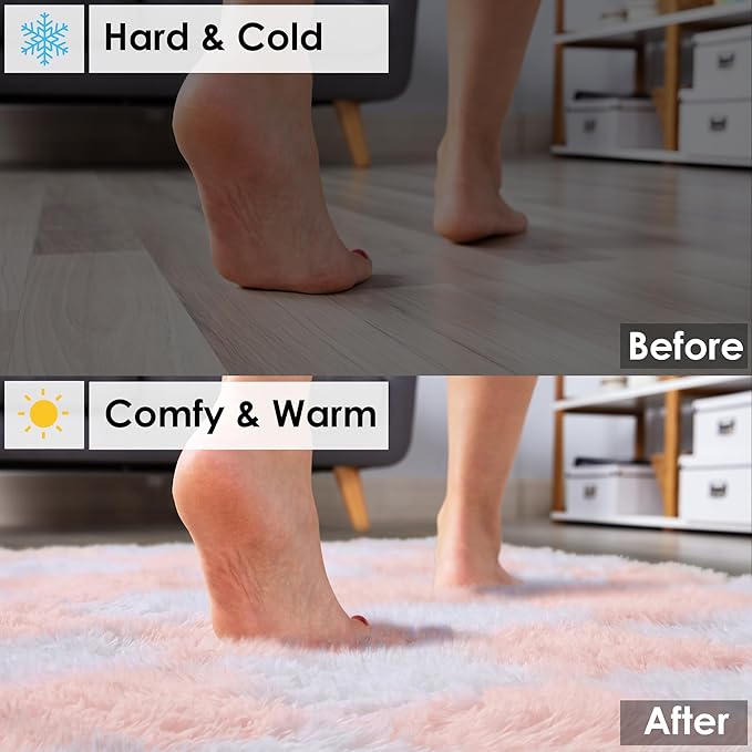 - Ultra Soft Pink Fluffy Rugs -- Feels like stepping on a fuzzy cloud! Our shag rug is made of microfiber and spongy interlayer, and the shaggy rug surface is covered with billions of 1.6" plush fibers pile, which can provide a warmth on the cold floor and feels comfortable when walking barefoot. Suitable for creating a comfy area for kids, family and pets.