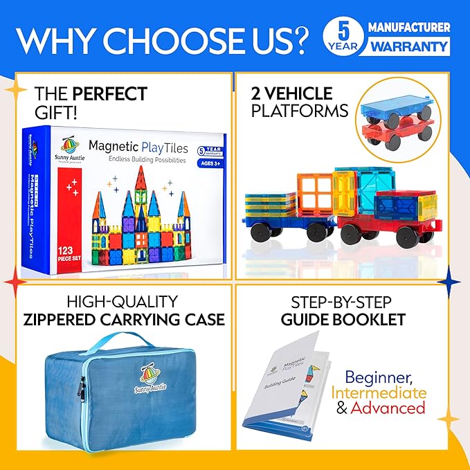 - 【THE ULTIMATE COLLECTION FOR FIRST-TIMERS!】This set is perfect for kids who have never tried magnetic tiles/blocks but will get plenty of use out of them once they get started. The set contains 123 magnetic tiles in various shapes, 2 Cars + a Bonus Zippered Carrying case, which is the perfect combination for building all of the most popular models and much more. It will occupy your kids for hours and bring them so much joy. Magnetic Play Tiles come with a full 5-year warranty!