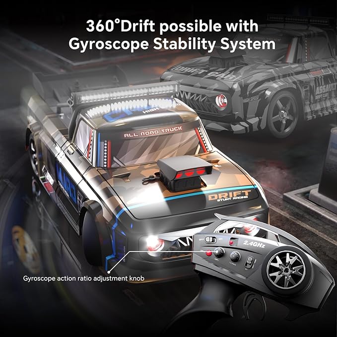 • Drift RC Car with GYRO: RC sport car has the function of ESC car stability system, which can correct the car's direction when the car loses control. The sensitivity of the car gyroscope sensor can be adjusted through the ESC knob of the transmitter