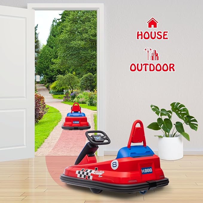 - 【Top Safety Features】The ride-on bumper car has an adjustable seat belt, anti-flat tires and sturdy plastic shell construction for a safer ride. This awesome electric vehicle has a soft PVC rubber anti-collision strip making it a safe ride on toy for your kids and protect walls and furniture.