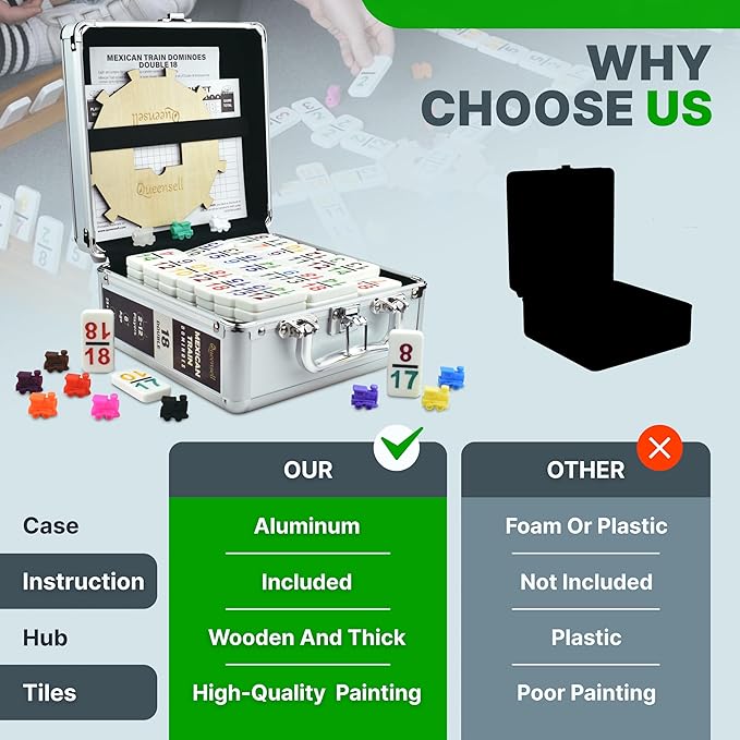• Double 18 Dominos Set for Adults Included: Wooden Hub, 190 Tiles with Numbers, 12 Plastic Trains, Score Pad, Instruction, and Aluminum Carrying Case