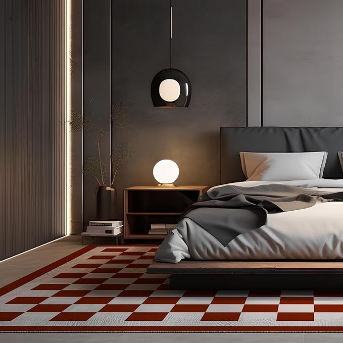 Washable 4x6 Checkered Area Rug for Living Room, Dark Red Checkerboard Modern Boho Large Rugs, Ultra Thin Low Pile Lightweight Indoor Carpet with Non-Slip Backing for Bedroom Kids Nursery Play Room