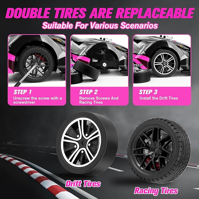 - MULTI-FUNCTIONAL TOY REMOTE CONTROL CAR: Equipped with multiple tire types, the rc cars drift features detachable 4 racing tires and 4 Drift tires, allowing you to experience the fun of racing and drifting with just one car. Both types of tires are detachable and replaceable, convenient for use in various locations. Enhancing the product's appeal and playability, the front of this drift remote control car features bright LED lights, making it more attractive and realistic for night driving.
