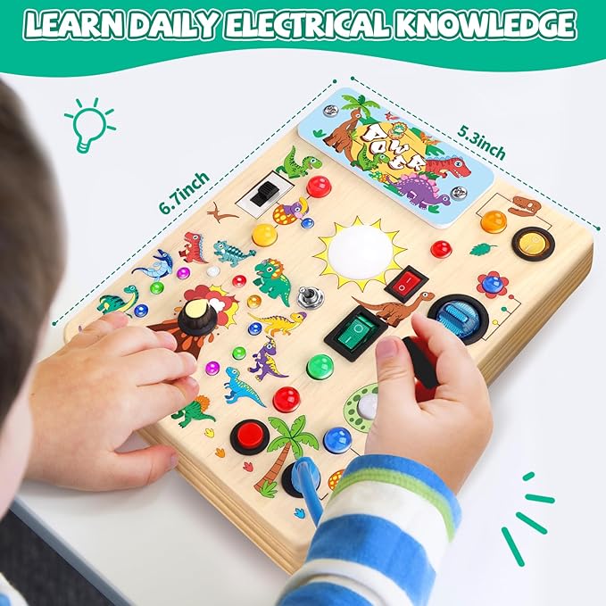 - Elaborate Design - This busy board is made especially for young children who like playing with switches and LED lights. On this busy board, there are 10 separate switches, and each switch relates to a different color or style of LED light. Each LED's brightness is set to be just right for the infant-not too bright, blinding, or dark to see well.A master switch is set up to turn off all LED lights with one click to avoid wasting power.