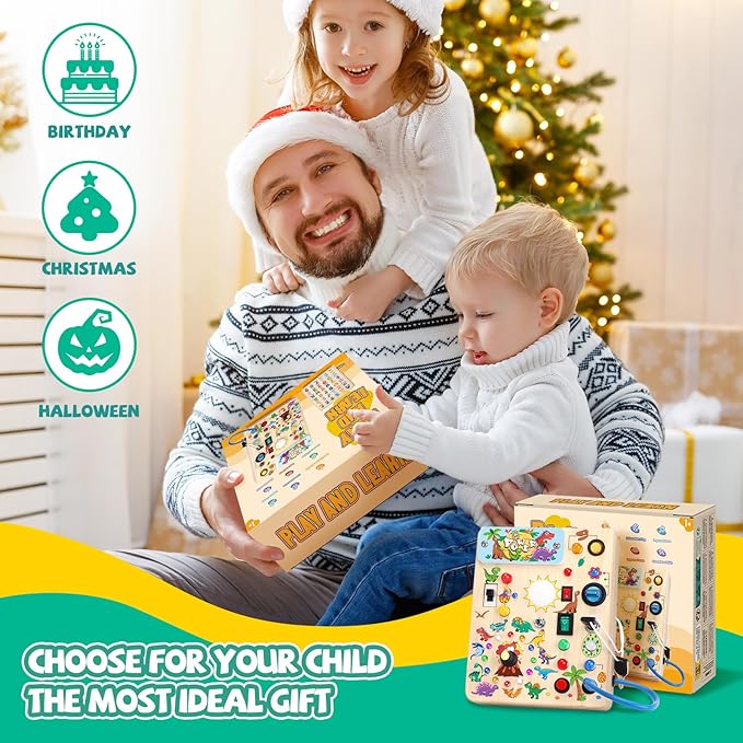- Learn and Play - This Montessori Busy Board is the ideal birthday or Christmas present for children. This toddler busy board may help toddlers learn the differences between colors and sizes. This tactile toy assists in developing a baby's hands-on and thinking abilities. Please prepare two AAA batteries before using them.