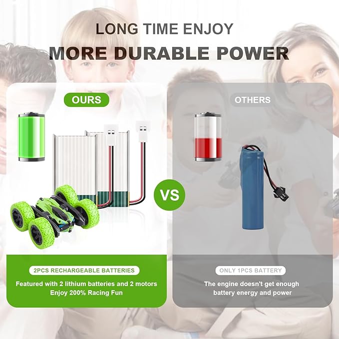 - RC STUNT CAR: Unlike ordinary toy cars, our RC stunt cars not only have the basic skills that RC cars should have, but also have the ability to roll in place 360 degrees and double-sided travelling, bringing a thrilling and unique experience for children and even adults. Our remote control car can handle various terrains, use the remote to make the car roll or double-sided driving can easily pass obstacles.