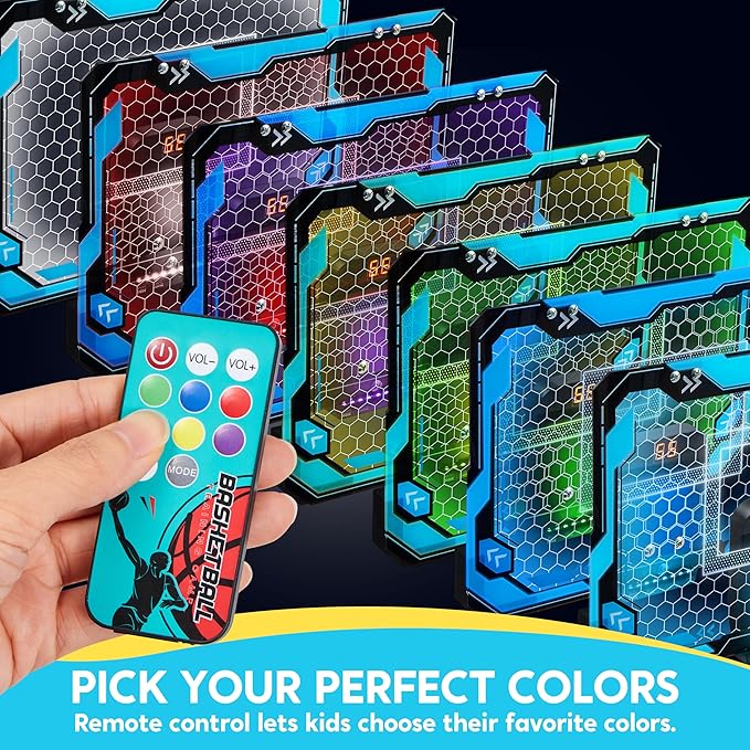 - 【All-in-One Excitement】: This set includes a glowing LED basketball board, remote control for light adjustments, 4 basketballs, a handy air pump, and a convenient ball rack, ensuring non-stop fun and games.