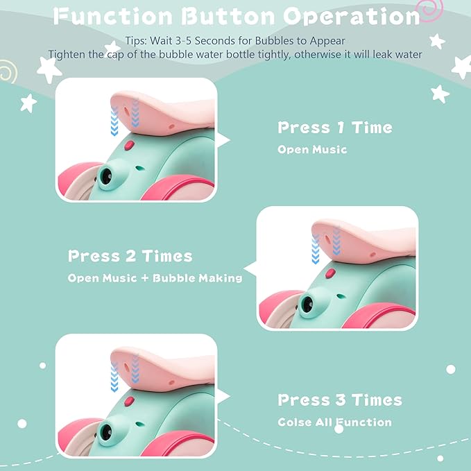 - Comfortable children's balanced motorcycle with remote control and bubble machine: Our riding toy features anti slip handles designed specifically for small hands, seats that conform to human body structure, making it more comfortable for children to sit on. The four wheels can ride smoothly on various surfaces, making it perfect for indoor and outdoor activities.