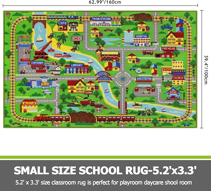- 【Educational Learning Kids Rug for Playroom】:This traffic road rug cleverly integrates roads, railways, and rivers, decorated with various patterns such as train stations, library, hospitals, container, museum, fire house, farm, gas stations, banks, tunnel, train etc., allowing children to learn a lot of knowledge while playing.