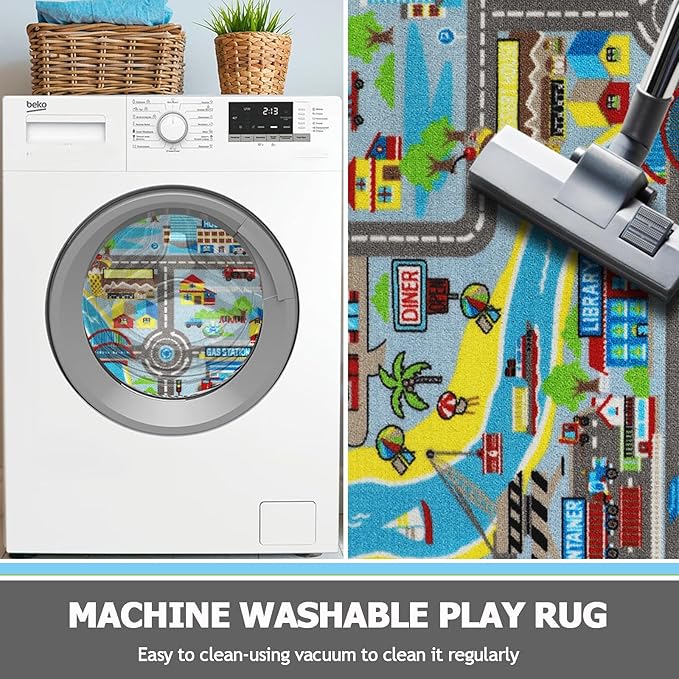 - 【Educational Learning Kids Rug for Playroom】:This traffic road rug cleverly integrates roads, railways, and rivers, decorated with various patterns such as train stations, library, hospitals, container, museum, fire house, farm, gas stations, banks, tunnel, train etc., allowing children to learn a lot of knowledge while playing.