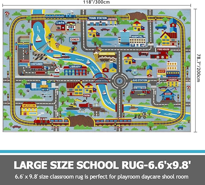 - 【Educational Learning Classroom Carpet】:This traffic road rug cleverly integrates roads, railways, and rivers, decorated with various patterns such as train stations, library, hospitals, container, museum, fire house, farm, gas stations, banks, tunnel, train etc., allowing children to learn a lot of knowledge while playing.