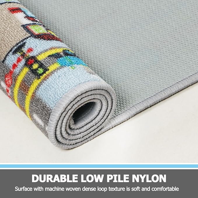 - 【Non Slip Kids Room Playmat Rug】:Capslpad train car rug is made of high-quality nylon materials, the carpet are double-wrapped-durable and solid. the surface with machine woven dense loop texture is soft and comfortable, the back with TPR is non-slip, keeps rug in place well when the floor is dry, ensure safety for your children.