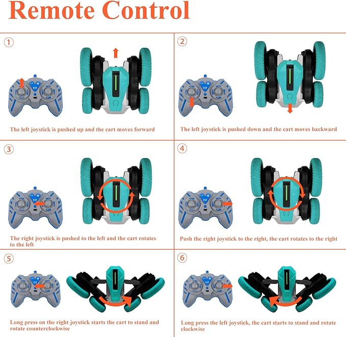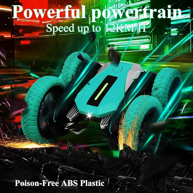 - 【𝐏𝐨𝐰𝐞𝐫𝐟𝐮𝐥 𝐑𝐞𝐜𝐡𝐚𝐫𝐠𝐞𝐚𝐛𝐥𝐞 𝐁𝐚𝐭𝐭𝐞𝐫𝐲】 Enjoy the thrill of driving for about 20-30 minutes at a time with 800mAh high-quality rechargeable batteries.It comes with a USB charging cable, making it as simple as plug-in, charge, and go! The stunt car can run both day and night, with fancy colorful lights that create endless fun for kids
